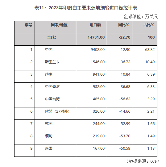 2023年,印度綢緞進(jìn)口額為1.47億美元,同比下降22.7%。