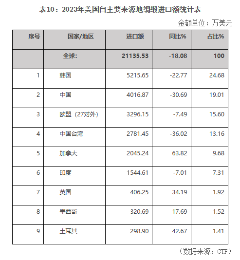 從2022年起,韓國(guó)超過中國(guó),成為美國(guó)綢緞進(jìn)口第一大來源地。