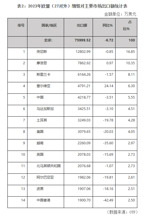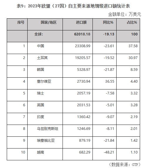 2023年,歐盟綢緞進(jìn)口穩(wěn)居首位,進(jìn)口額為6.20億美元,同比下降19.13%。