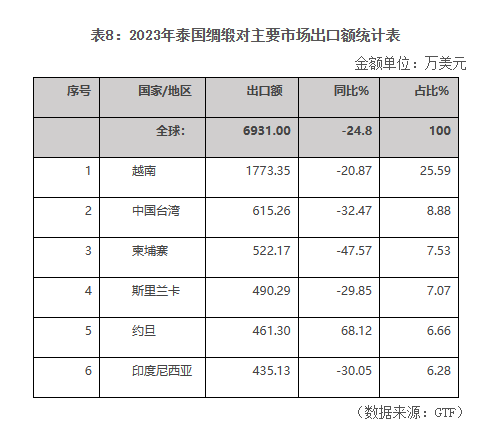 2023年,泰國(guó)綢緞出口額為0.69億美元,同比下降24.80%。