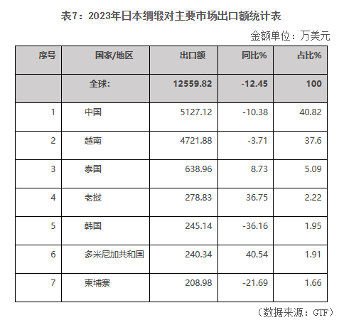 2023年,日本綢緞出口額為1.26億美元,同比下滑12.45%。