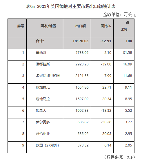 在主要市場(chǎng)中,對(duì)墨西哥、多米尼加共和國(guó)、尼加拉瓜和危地馬拉出口均呈現(xiàn)不同程度的增長(zhǎng),但難挽美國(guó)綢緞出口頹勢(shì),主要原因是對(duì)第二大市場(chǎng)洪都拉斯的出口降幅近40%(詳見表6)。
