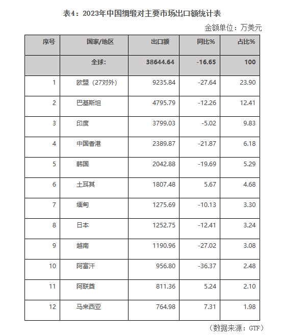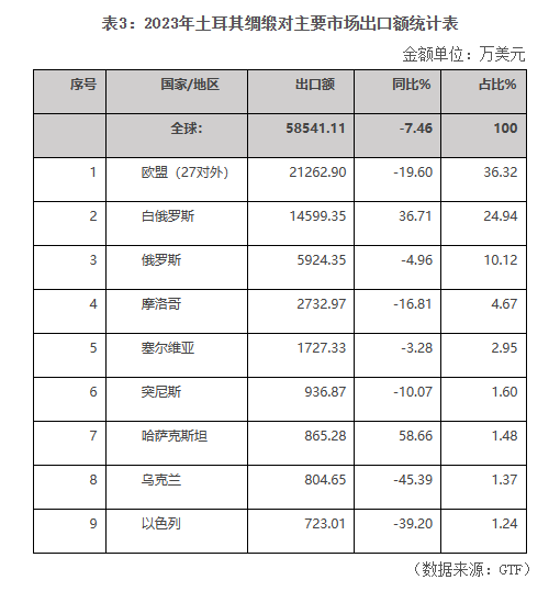 2023年,土耳其綢緞出口額為5.85億美元,僅次于歐盟,同比下滑7.46%。