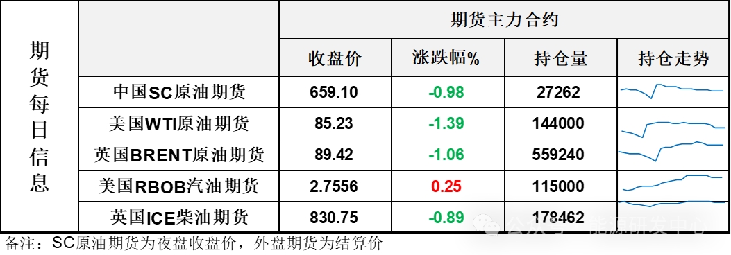 【1】WTI主力原油期貨收跌1.2美元,跌幅1.39%,報(bào)85.23美元/桶;布倫特主力原油期貨收跌0.96美元,跌幅1.06%,報(bào)89.42美元/桶;INE原油期貨收跌0.98%,報(bào)659.1元。