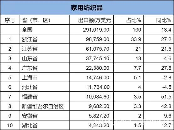 2024年1-2月紡織服裝類重點商品出口前十名的省(市、區(qū))