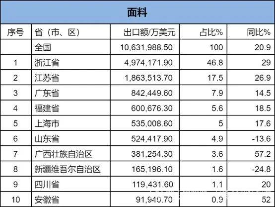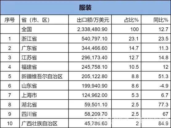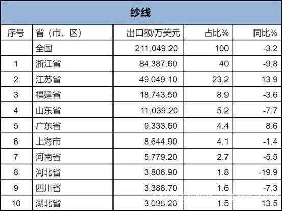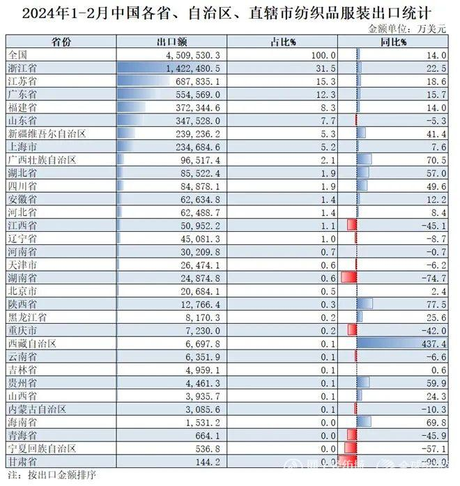 2024年1-2月,我國紡織服裝累計出口450.95億美元,同比增長14%。內地31個省、自治區(qū)、直轄市紡織服裝統(tǒng)計數(shù)據(jù)已出爐,浙江省、江蘇省、廣東省、福建省、山東省分別列全國紡織服裝出口省市前五位,合計比重超七成。
