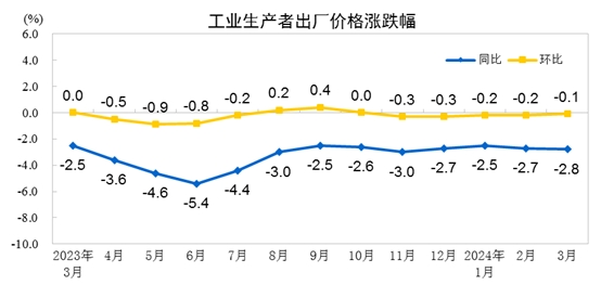 2024年3月份,全國工業(yè)生產(chǎn)者出廠價格同比下降2.8%,環(huán)比下降0.1%;工業(yè)生產(chǎn)者購進價格同比下降3.5%,環(huán)比下降0.1%。一季度,工業(yè)生產(chǎn)者出廠價格比上年同期下降2.7%,工業(yè)生產(chǎn)者購進價格下降3.4%。