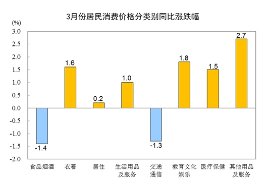 3月份,全國居民消費價格環(huán)比下降1.0%。其中,城市下降1.0%,農(nóng)村下降0.7%;食品價格下降3.2%,非食品價格下降0.5%;消費品價格下降0.9%,服務(wù)價格下降1.1%。