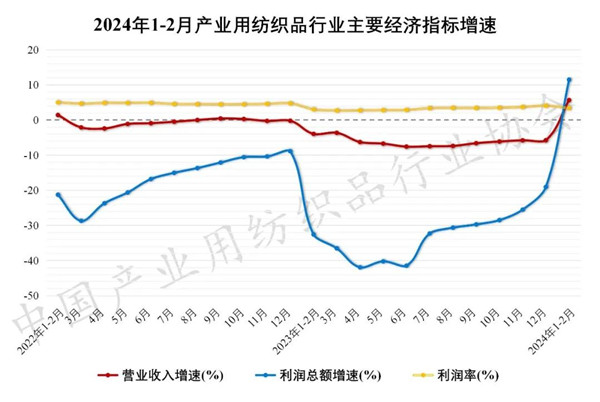 2024年前兩個(gè)月,全球經(jīng)濟(jì)態(tài)勢(shì)較為穩(wěn)定,制造業(yè)逐步擺脫疲弱狀態(tài);國(guó)內(nèi)經(jīng)濟(jì)隨著宏觀組合政策靠前發(fā)力持續(xù)恢復(fù),加上春節(jié)假期的有力帶動(dòng),國(guó)民經(jīng)濟(jì)起步平穩(wěn)、穩(wěn)中有升。2024年1-2月產(chǎn)業(yè)用紡織品行業(yè)的工業(yè)增加值增速自2023年1-2月出現(xiàn)負(fù)增長(zhǎng)以來(lái)首次實(shí)現(xiàn)轉(zhuǎn)正,行業(yè)經(jīng)濟(jì)開局良好、量效雙增。