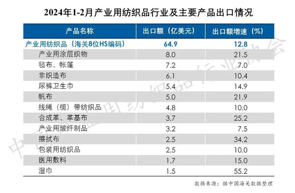 國(guó)際貿(mào)易方面,根據(jù)中國(guó)海關(guān)數(shù)據(jù)(海關(guān)8位HS編碼統(tǒng)計(jì)數(shù)據(jù)),2024年1-2月我國(guó)產(chǎn)業(yè)用紡織品行業(yè)的出口額為64.9億美元,同比增長(zhǎng)12.8%;1-2月行業(yè)進(jìn)口額為7億美元,同比下降10.1%。
