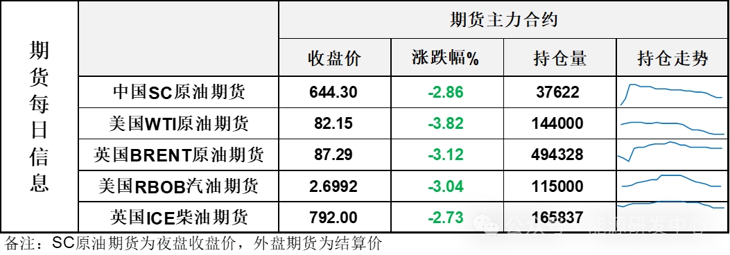 【1】WTI主力原油期貨收跌3.26美元,跌幅3.82%,報(bào)82.15美元/桶;布倫特主力原油期貨收跌2.81美元,跌幅3.12%,報(bào)87.29美元/桶;INE原油期貨收跌2.86%,報(bào)644.3元。