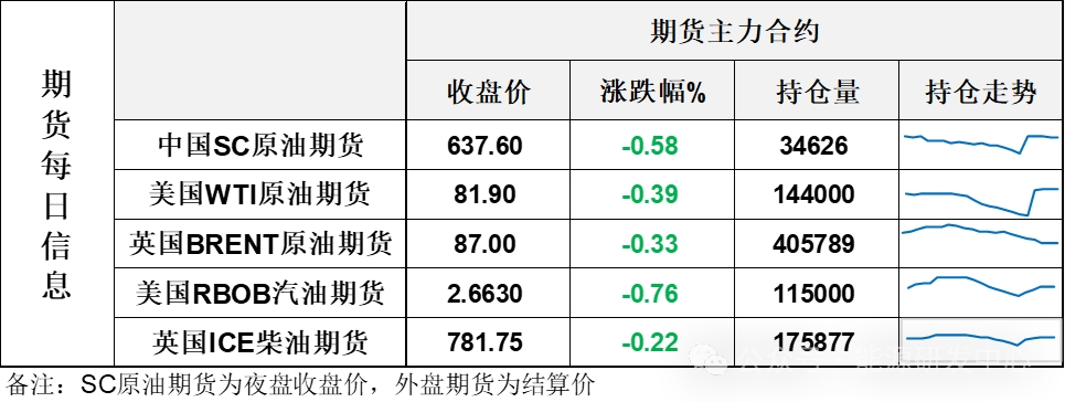 【1】WTI主力原油期貨收跌0.32美元,跌幅0.39%,報(bào)81.9美元/桶;布倫特主力原油期貨收跌0.29美元,跌幅0.33%,報(bào)87美元/桶;INE原油期貨收跌0.58%,報(bào)637.6元。