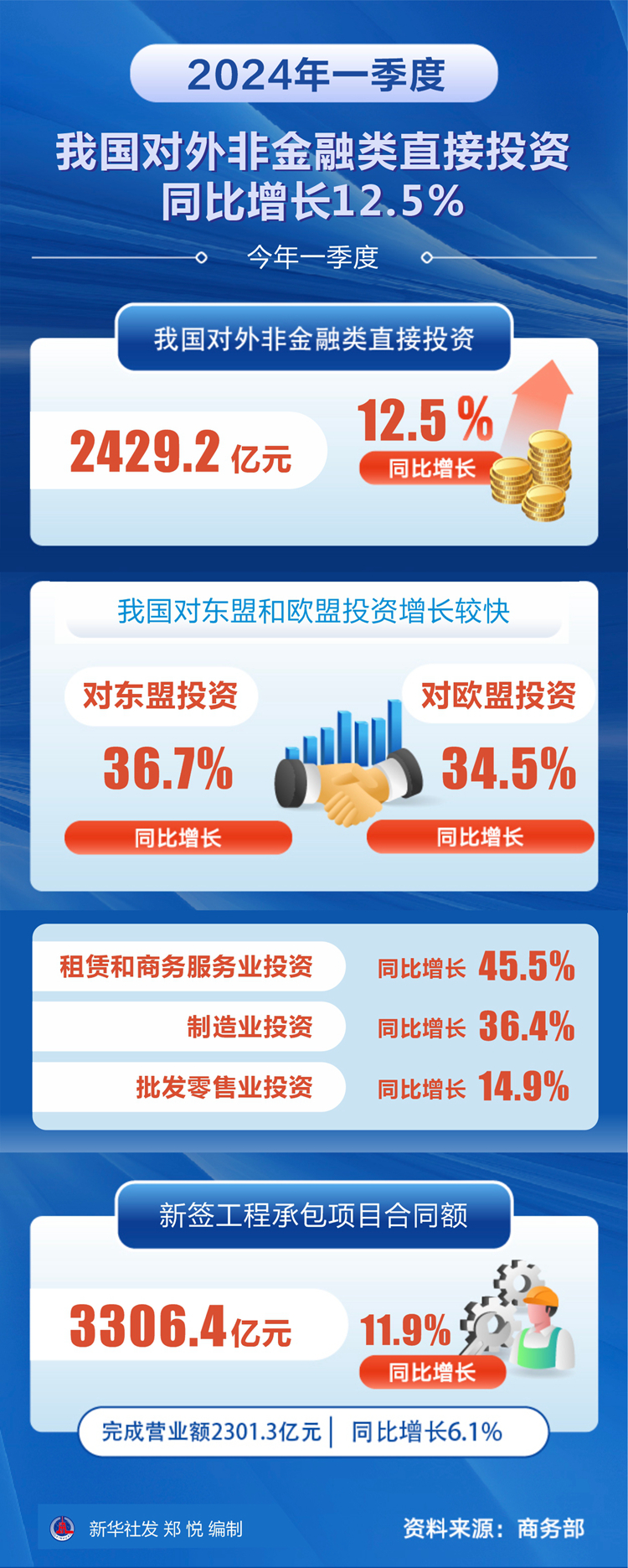 2024年一季度我國對外非金融類直接投資同比增長12.5%