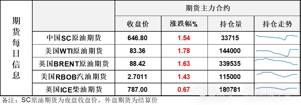 【1】WTI主力原油期貨收漲1.46美元,漲幅1.78%,報83.36美元/桶;布倫特主力原油期貨收漲1.42美元,漲幅1.63%,報88.42美元/桶;INE原油期貨收漲1.54%,報646.8元。