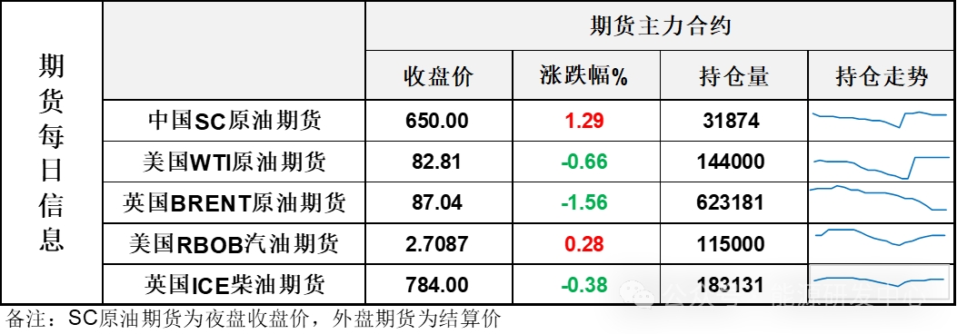 【1】WTI主力原油期貨收跌0.55美元,跌幅0.66%,報(bào)82.81美元/桶;布倫特主力原油期貨收跌1.38美元,跌幅1.56%,報(bào)87.04美元/桶;INE原油期貨收漲1.29%,報(bào)650元。