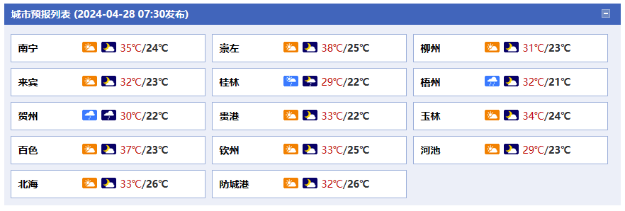 南寧市:今天白天到晚上,多云到晴、局地有陣雨或雷雨,東南風(fēng)1~2級,最高氣溫35℃,最低氣溫24℃。