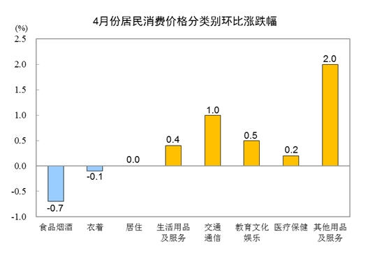 4月份,全國居民消費價格環(huán)比上漲0.1%。其中,城市上漲0.1%,農村持平;食品價格下降1.0%,非食品價格上漲0.3%;消費品價格下降0.1%,服務價格上漲0.3%。