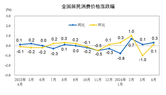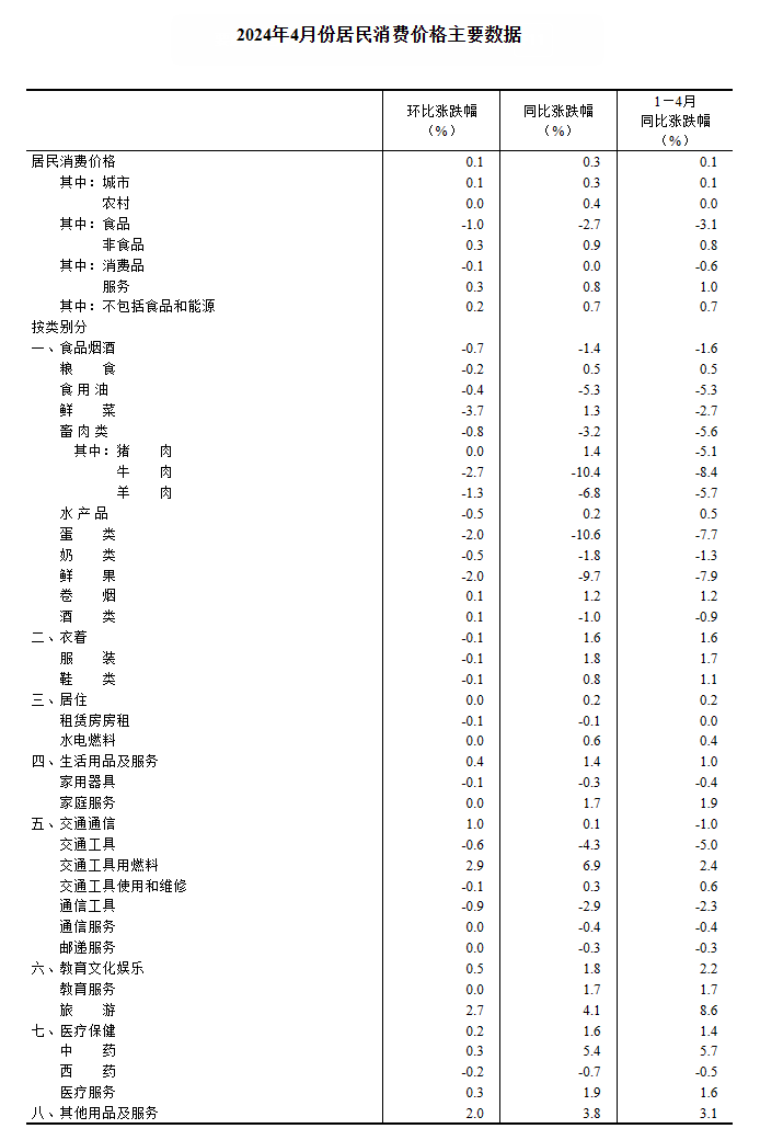 2024年4月份,全國居民消費價格同比上漲0.3%。其中,城市上漲0.3%,農村上漲0.4%;食品價格下降2.7%,非食品價格上漲0.9%;消費品價格持平,服務價格上漲0.8%。1—4月平均,全國居民消費價格比上年同期上漲0.1%。