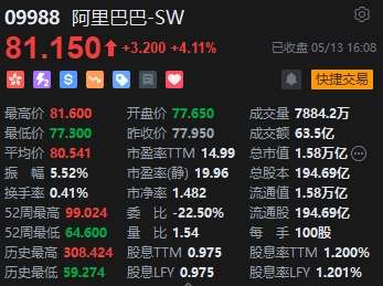 阿里巴巴大漲4%。阿里巴巴將于5月14日美股盤(pán)前公布2024財(cái)年第四季度業(yè)績(jī)。機(jī)構(gòu)普遍預(yù)計(jì),阿里將在最新季度實(shí)現(xiàn)營(yíng)收2198.32億元人民幣,同比增長(zhǎng)5.58%;每股收益5.41元,同比減少39.88%。