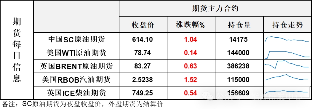 【1】WTI主力原油(614, 8.20, 1.35%)期貨收漲0.11美元,漲幅0.14%,報78.74美元/桶;布倫特主力原油期貨收漲0.52美元,漲幅0.63%,報83.27美元/桶;INE原油期貨收漲1.04%,報614.1元。