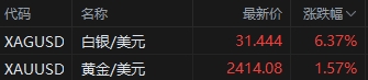 截至周五(5月17日)收盤(pán),現(xiàn)貨黃金(577, 13.34, 2.37%)漲超1.5%報(bào)每盎司2414美元,逼近上個(gè)月創(chuàng)下的紀(jì)錄高位;現(xiàn)貨白銀(8211, 608.00, 8.00%)漲勢(shì)更猛,單日暴漲6.3%,最高報(bào)每盎司31.06美元,刷新近11年的新高。