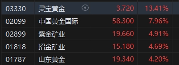 黃金股集體大漲,靈寶黃金漲超13%。消息面上,海內外降息預期提升疊加中東地緣政治風險再起,黃金價格持續(xù)上漲。現貨黃金向上觸及2450美元/盎司,日內漲1.5%,續(xù)刷歷史新高;此外,5月20日,周大福(11.26, 0.38, 3.49%)等多家黃金珠寶品牌官網顯示,其國內足金首飾金價均突破742元/克。