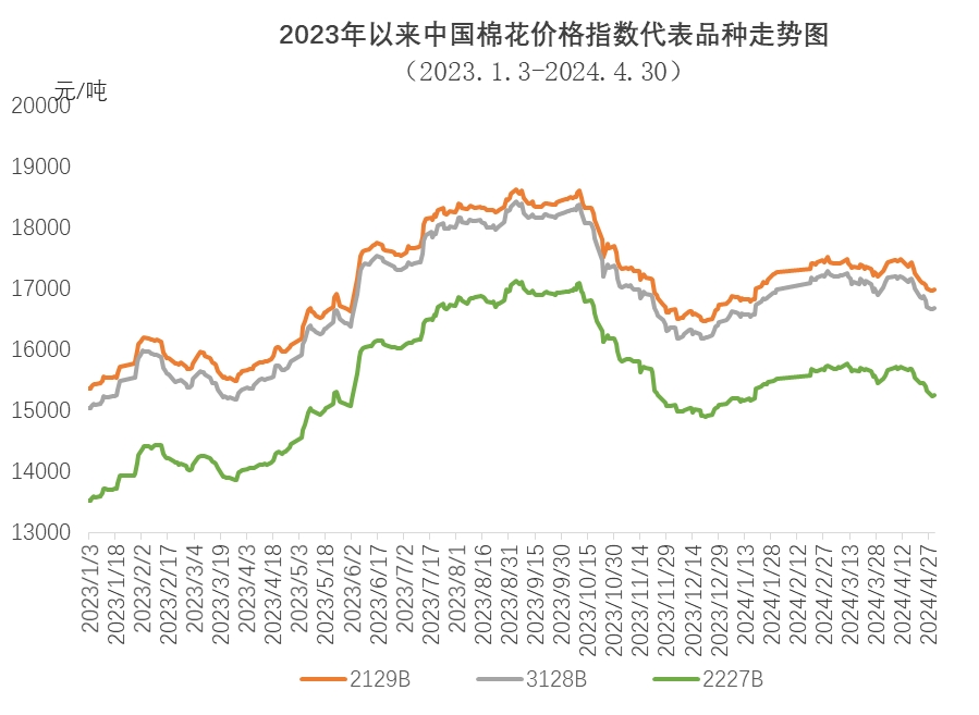 4月,中國棉花價格指數(shù)(CCIndex3128B)維持下跌走勢,28日跌至近4個月的低點,為16661元/噸,30日收于16681元/噸,環(huán)比下跌214元。月內前期紡織需求略有好轉,紗線銷售較快,但中旬后需求轉弱,棉價下跌,企業(yè)對后市信心不足,多持觀望態(tài)度,原料采購偏謹慎,以隨用隨買逢低補庫為主。4月中國棉花價格指數(shù)(CCIndex3128B)月均價為17007元/噸,環(huán)比下跌115元,同比上漲1419元。