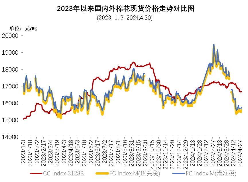 4月,美聯(lián)儲降息預期推遲,美元不斷走強,美棉簽約數(shù)據(jù)偏弱,ICE期棉主力合約持續(xù)下跌,由月初最高92.9美分/磅跌至月末的78.03美分/磅,創(chuàng)近4個月以來新低。4月ICE期棉主力合約月均結算價在84.35美分/磅,環(huán)比下跌9.57美分,跌幅10.2%。中國進口棉價格指數(shù)FCIndex M月均為92.64美分/磅,環(huán)比下跌11.42美分;月底為89.36美分/磅,環(huán)比下跌11.32美分,1%關稅下折人民幣15592元/噸,低于同期中國棉花價格指數(shù)(CCIndex3128B)1089元。