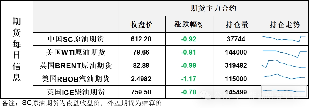 【1】WTI主力原油期貨收跌0.64美元,跌幅0.81%,報(bào)78.66美元/桶;布倫特主力原油期貨收跌0.83美元,跌幅0.99%,報(bào)82.88美元/桶;INE原油期貨收跌0.92%,報(bào)612.2元。