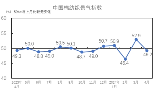 說明:中國棉紡織行業(yè)景氣指數(shù)采集自全國近500家次棉紡織企業(yè),參考國家制造業(yè)PMI等指數(shù)制定方式,通過對多個主要指標(biāo)加權(quán)計(jì)算得出,當(dāng)指數(shù)高于50,表示棉紡織行業(yè)本月景氣程度好于上月,低于50則表示本月景氣程度不及上月。