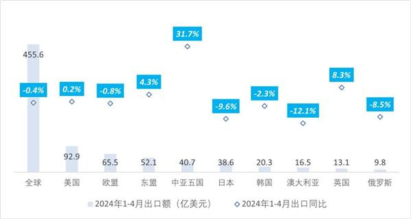 今年1~4月我國對全球出口服裝及衣著附件455.6億美元,同比微降0.4%。其中,我國對美國、東盟、英國等主要市場出口服裝金額保持平穩(wěn)增長,對中亞五國服裝出口額同比大幅增長31.7%,特別是對哈薩克斯坦出口增速高達(dá)90%。