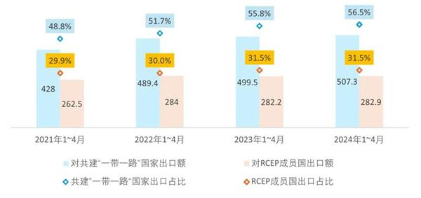 RCEP作為全球規(guī)模最大的自貿(mào)協(xié)定,自生效實(shí)施以來,在降低區(qū)域國際貿(mào)易成本、活躍商品貿(mào)易、強(qiáng)化產(chǎn)業(yè)鏈供應(yīng)鏈韌性、實(shí)現(xiàn)優(yōu)勢資源互補(bǔ)等方面發(fā)揮了重要作用。2024年是協(xié)定生效實(shí)施的第三年,今年1~4月,我國對RCEP成員國出口紡織品服裝金額上年同期基本持平,保持了約280億的出口額,較2021年協(xié)議生效前同期增長7.8%,RCEP國家占我行業(yè)出口總額比重從2021年的29.9%提升至目前的31.5%。其中,我國紡織紗線、紡織面料等中間產(chǎn)品對RCEP成員國出口額同比增長約6.6%,好于服裝出口情況。