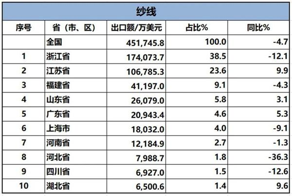 中國紡織品進(jìn)出口商會近日發(fā)布的相關(guān)分析報(bào)告顯示,從紡織服裝類重點(diǎn)商品出口前十名的省(區(qū)、市)來看,紗線出口方面,在浙江、福建等省份下滑的情況下,湖北紗線出口額穩(wěn)定增長。2024年1-3月,湖北紗線出口額同比增長8.8%;2024年1-4月,湖北省紗線出口額同比增長9.6%。