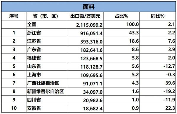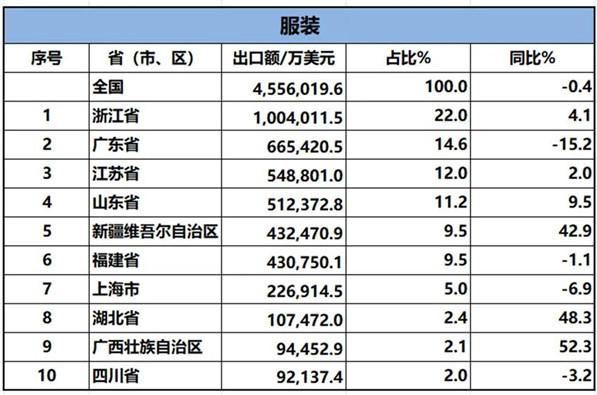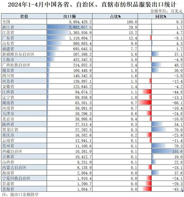 2024年1-4月,我國紡織品服裝累計(jì)出口898.44億美元,同比增長0.3%。內(nèi)地31個(gè)省、自治區(qū)、直轄市紡織品服裝統(tǒng)計(jì)數(shù)據(jù)已出爐,浙江省、江蘇省、廣東省、山東省、福建省分別列全國紡織品服裝出口省市前五位,合計(jì)比重超七成。