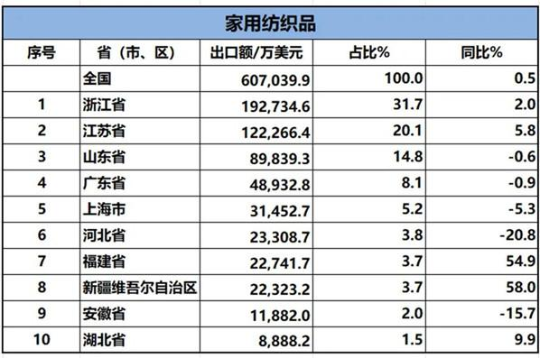 家用紡織品出口方面,湖北、新疆、福建快速增長。2024年1-4月,新疆家用紡織品出口額同比增長58%,躍居排名首位。