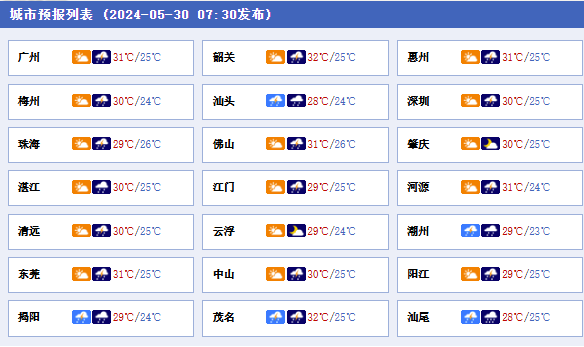 城市方面,廣州今天白天多云到陰天,午后有分散雷陣雨;夜間多云到陰天,有雷陣雨;氣溫介于24~30℃之間,相對(duì)濕度介于60%~95%之間,吹輕微至和緩的偏東風(fēng)。