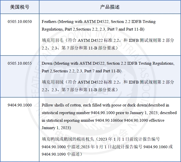 美國貿(mào)易代表辦公室(USTR)當(dāng)?shù)貢r間2024年5月24日宣布,將429項產(chǎn)品的301關(guān)稅豁免臨時延長兩周,從2024年5月31日延長至2024年6月14日,同時將其中部分產(chǎn)品豁免期限延長至2025年5月31日,包括0505.10.0050填充用羽毛、0505.10.0055填充用羽絨和9404.90.1000填充鴨絨或鵝絨的棉質(zhì)枕頭三項產(chǎn)品(具體見下表)。