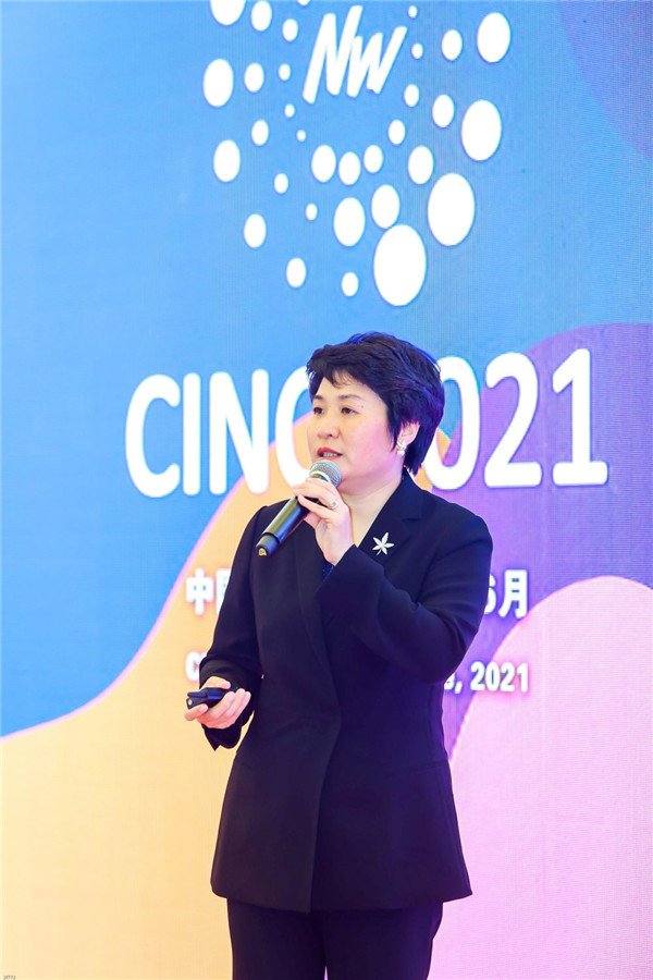 圖為李桂梅在2021年第十屆中國國際非織造布會議上作主題報(bào)告(2021年6月22日攝)。