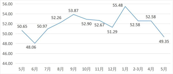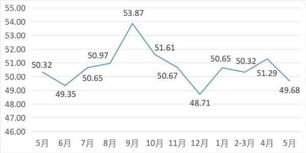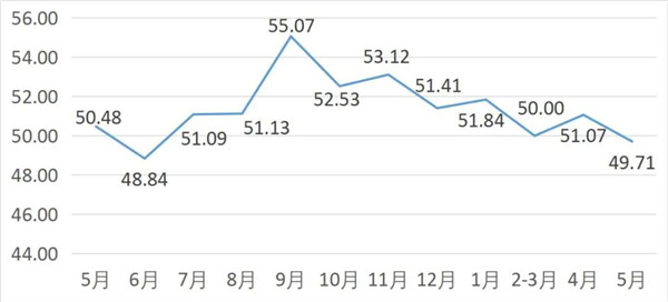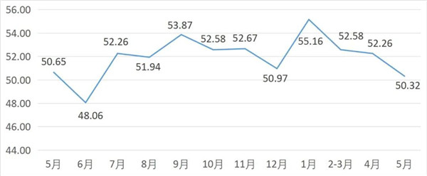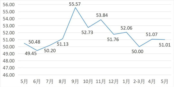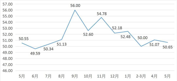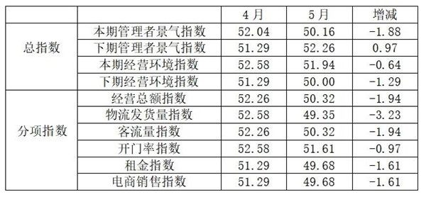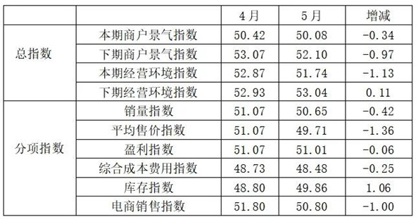 從商戶景氣指數(shù)來(lái)看,總指數(shù)中,5月商戶景氣指數(shù)為50.08, 較上月下降0.34個(gè)百分點(diǎn);經(jīng)營(yíng)環(huán)境指數(shù)為51.74, 較上月下降1.13個(gè)百分點(diǎn)。