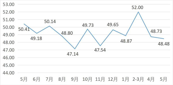 5月,2.17%的市場(chǎng)商戶綜合成本費(fèi)用減少,較上月下降1.83個(gè)百分點(diǎn);10.14%的市場(chǎng)商戶庫(kù)存減少,較上月上升4.81個(gè)百分點(diǎn)。綜合成本指數(shù)降至50以下,顯示4月市場(chǎng)商戶的成本壓力較大,庫(kù)存指數(shù)向50靠攏,商戶庫(kù)存壓力得到一定緩解。
