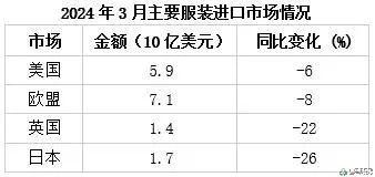 美國(guó)、歐盟、英國(guó)和日本等關(guān)鍵市場(chǎng)的進(jìn)口數(shù)據(jù)嚴(yán)峻。美國(guó)是全球最大的服裝進(jìn)口國(guó),2024年3月,美國(guó)的服裝進(jìn)口額同比下降6%,至59億美元。同樣,歐盟、英國(guó)和日本分別下降了8%、22%、22%和26%,凸顯出全球需求的下降。服裝進(jìn)口的下降意味著主要地區(qū)服裝市場(chǎng)的萎縮。