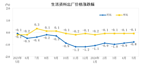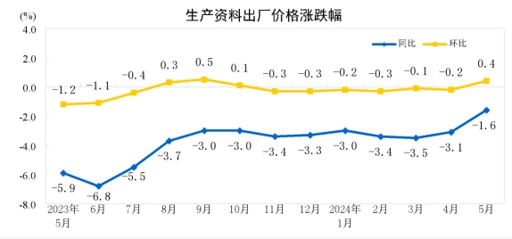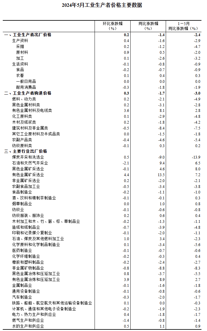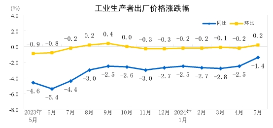2024年5月份,全國工業(yè)生產者出廠價格同比下降1.4%,降幅比上月收窄1.1個百分點,環(huán)比上漲0.2%,上月為下降0.2%;工業(yè)生產者購進價格同比下降1.7%,環(huán)比上漲0.3%。1—5月平均,工業(yè)生產者出廠價格比上年同期下降2.4%,工業(yè)生產者購進價格下降3.0%。