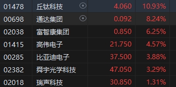 6月13日消息,港股三大指數(shù)探底回升,截至收盤,恒生指數(shù)(18112.631, 174.79, 0.97%)漲0.97%,報18112.63點,恒生科技指數(shù)(3739.14, 47.86, 1.30%)漲1.3%,國企指數(shù)漲0.98%。盤面上,科網(wǎng)股普漲,美團漲超3%,小米、騰訊漲超2%,京東漲近2%,聯(lián)想、百度漲超1%;汽車股部分上漲,比亞迪股份(232.8, 12.80, 5.82%)漲超5%;蘋果概念股漲幅靠前,丘鈦科技(4.06, 0.40, 10.93%)漲近11%;芯片漲價潮延續(xù),半導體概念股齊漲,華虹半導體(23.55, 1.20, 5.37%)漲超5%;電力股普遍走強,中國電力(3.92, 0.20, 5.38%)漲超5%。