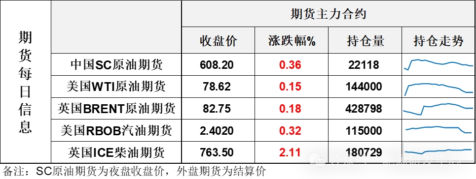 【1】WTI主力原油期貨收漲0.12美元,漲幅0.15%,報78.62美元/桶;布倫特主力原油期貨收漲0.15美元,漲幅0.18%,報82.75美元/桶;INE原油期貨收漲0.36%,報608.2元。