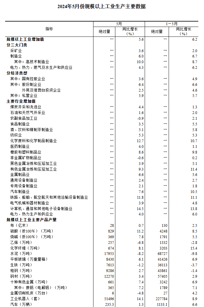5月份,規(guī)模以上工業(yè)增加值同比實(shí)際增長(zhǎng)5.6%(增加值增速均為扣除價(jià)格因素的實(shí)際增長(zhǎng)率)。從環(huán)比看,5月份,規(guī)模以上工業(yè)增加值比上月增長(zhǎng)0.30%。1—5月份,規(guī)模以上工業(yè)增加值同比增長(zhǎng)6.2%。
