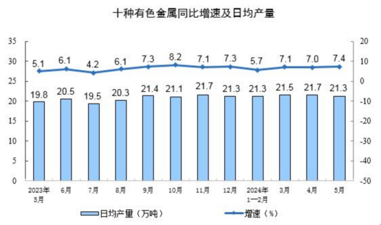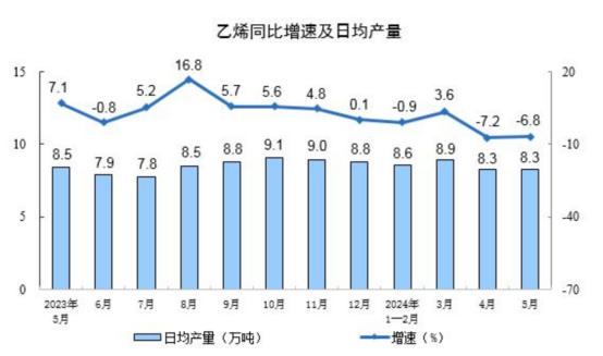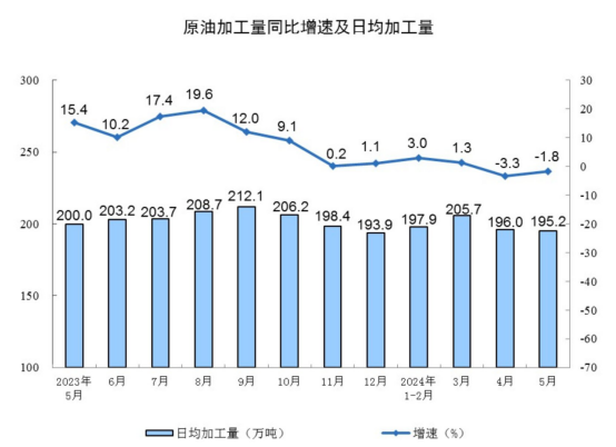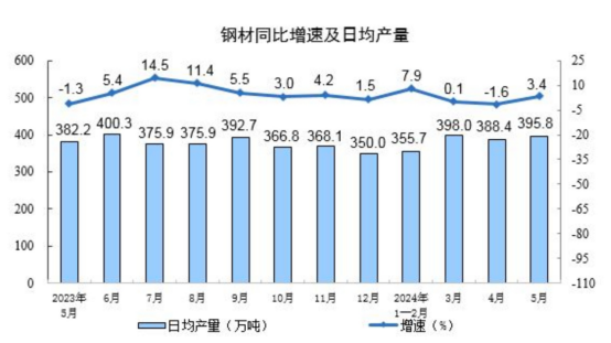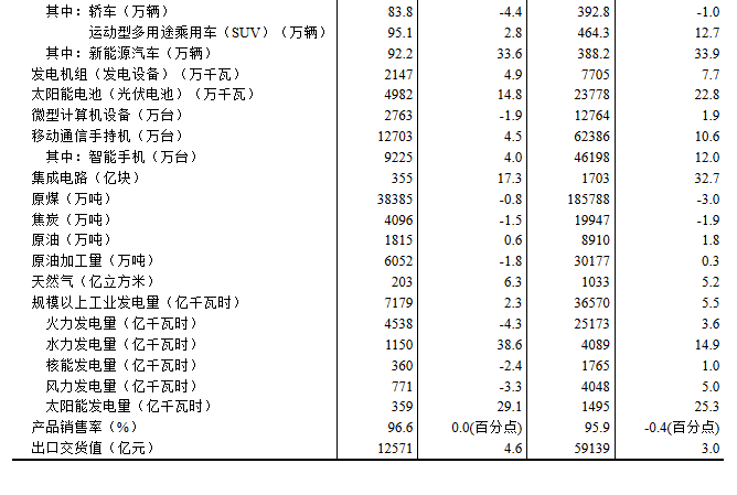 分產(chǎn)品看,5月份,619種產(chǎn)品中有352種產(chǎn)品產(chǎn)量同比增長(zhǎng)。其中,鋼材12270萬(wàn)噸,同比增長(zhǎng)3.4%;水泥17953萬(wàn)噸,下降8.2%;十種有色金屬661萬(wàn)噸,增長(zhǎng)7.4%;乙烯257萬(wàn)噸,下降6.8%;汽車235.3萬(wàn)輛,增長(zhǎng)1.3%,其中新能源汽車92.2萬(wàn)輛,增長(zhǎng)33.6%;發(fā)電量7179億千瓦時(shí),增長(zhǎng)2.3%;原油加工量6052萬(wàn)噸,下降1.8%。