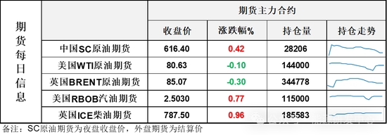 【1】因假日外盤提前收盤,WTI主力原油期貨收跌0.07美元,跌幅0.1%,報(bào)80.63美元/桶;布倫特主力原油期貨收跌0.26美元,跌幅0.3%,報(bào)85.07美元/桶;INE原油期貨收漲0.42%,報(bào)616.4元。