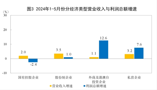 1—5月份,規(guī)模以上工業(yè)企業(yè)中,國(guó)有控股企業(yè)實(shí)現(xiàn)利潤(rùn)總額9438.4億元,同比下降2.4%;股份制企業(yè)實(shí)現(xiàn)利潤(rùn)總額20510.5億元,增長(zhǎng)1.0%;外商及港澳臺(tái)投資企業(yè)實(shí)現(xiàn)利潤(rùn)總額6827.8億元,增長(zhǎng)12.6%;私營(yíng)企業(yè)實(shí)現(xiàn)利潤(rùn)總額7329.3億元,增長(zhǎng)7.6%。