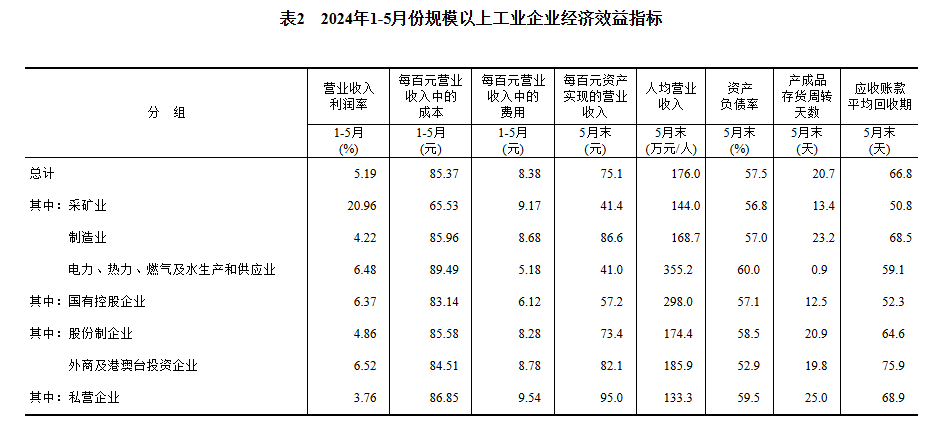 5月末,規(guī)模以上工業(yè)企業(yè)每百元資產(chǎn)實(shí)現(xiàn)的營(yíng)業(yè)收入為75.1元,同比減少2.4元;人均營(yíng)業(yè)收入為176.0萬(wàn)元,同比增加7.7萬(wàn)元;產(chǎn)成品存貨周轉(zhuǎn)天數(shù)為20.7天,同比持平;應(yīng)收賬款平均回收期為66.8天,同比增加3.4天。