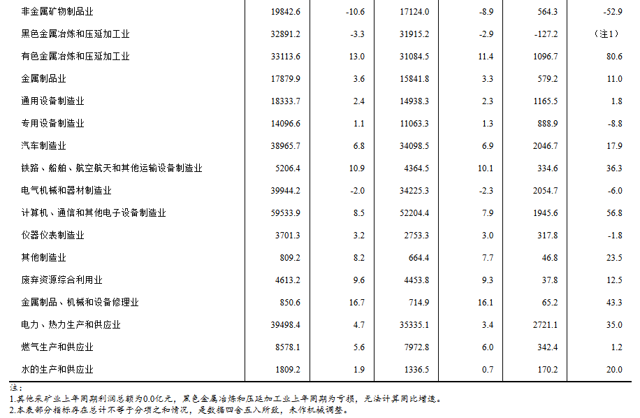 1—5月份,主要行業(yè)利潤(rùn)情況如下:有色金屬冶煉和壓延加工業(yè)利潤(rùn)同比增長(zhǎng)80.6%,計(jì)算機(jī)、通信和其他電子設(shè)備制造業(yè)增長(zhǎng)56.8%,電力、熱力生產(chǎn)和供應(yīng)業(yè)增長(zhǎng)35.0%,紡織業(yè)增長(zhǎng)23.2%,汽車(chē)制造業(yè)增長(zhǎng)17.9%,農(nóng)副食品加工業(yè)增長(zhǎng)17.1%,石油和天然氣開(kāi)采業(yè)增長(zhǎng)5.3%,通用設(shè)備制造業(yè)增長(zhǎng)1.8%,化學(xué)原料和化學(xué)制品制造業(yè)下降2.7%,電氣機(jī)械和器材制造業(yè)下降6.0%,專(zhuān)用設(shè)備制造業(yè)下降8.8%,煤炭開(kāi)采和洗選業(yè)下降31.8%,非金屬礦物制品業(yè)下降52.9%,石油煤炭及其他燃料加工業(yè)由盈轉(zhuǎn)虧,黑色金屬冶煉和壓延加工業(yè)虧損增加。